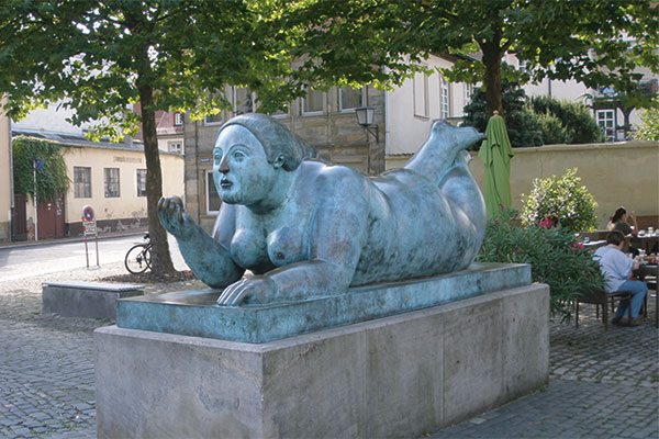 "Die Liegende mit Frucht", eine Skulptur des kolumbianischen Bildhauers Fernando Botero am Bamberger Heumarkt.