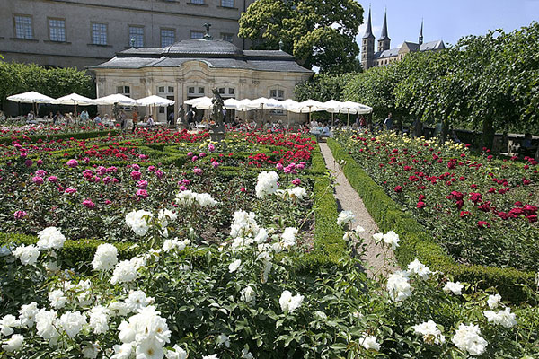 Der Rosengarten im Innenhof der Neuen Residenz glänzt mit seiner Blütenpracht und einem herrlichen Blick auf den Michaelsberg.